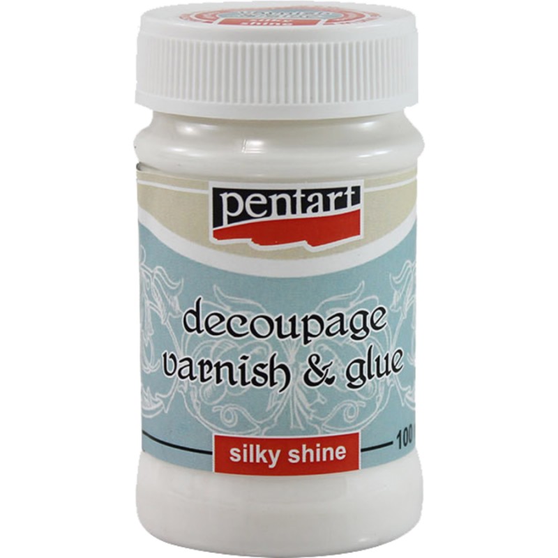 Satynowy klej do decoupagu . Służy do przyklejania papieru ryżowego do ozdabianych powierzchni. Po wyschnięciu można użyć go również jako werniksu co utworzy wodoodporną powłokę.