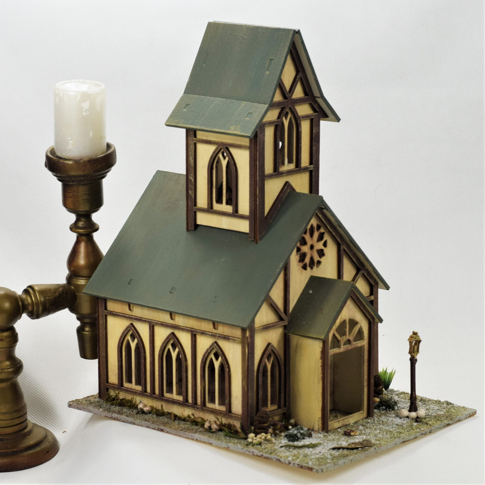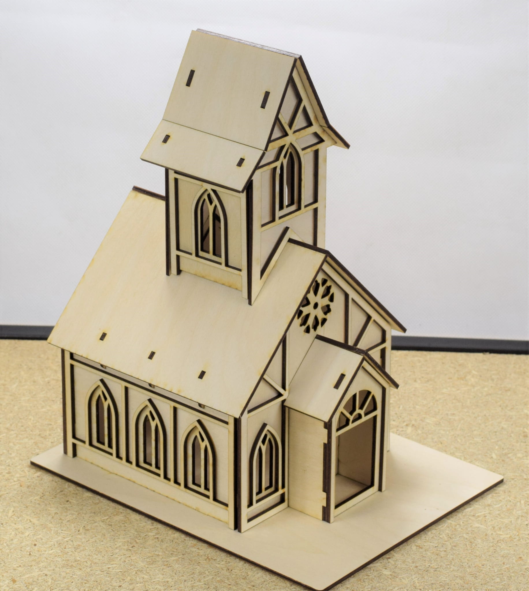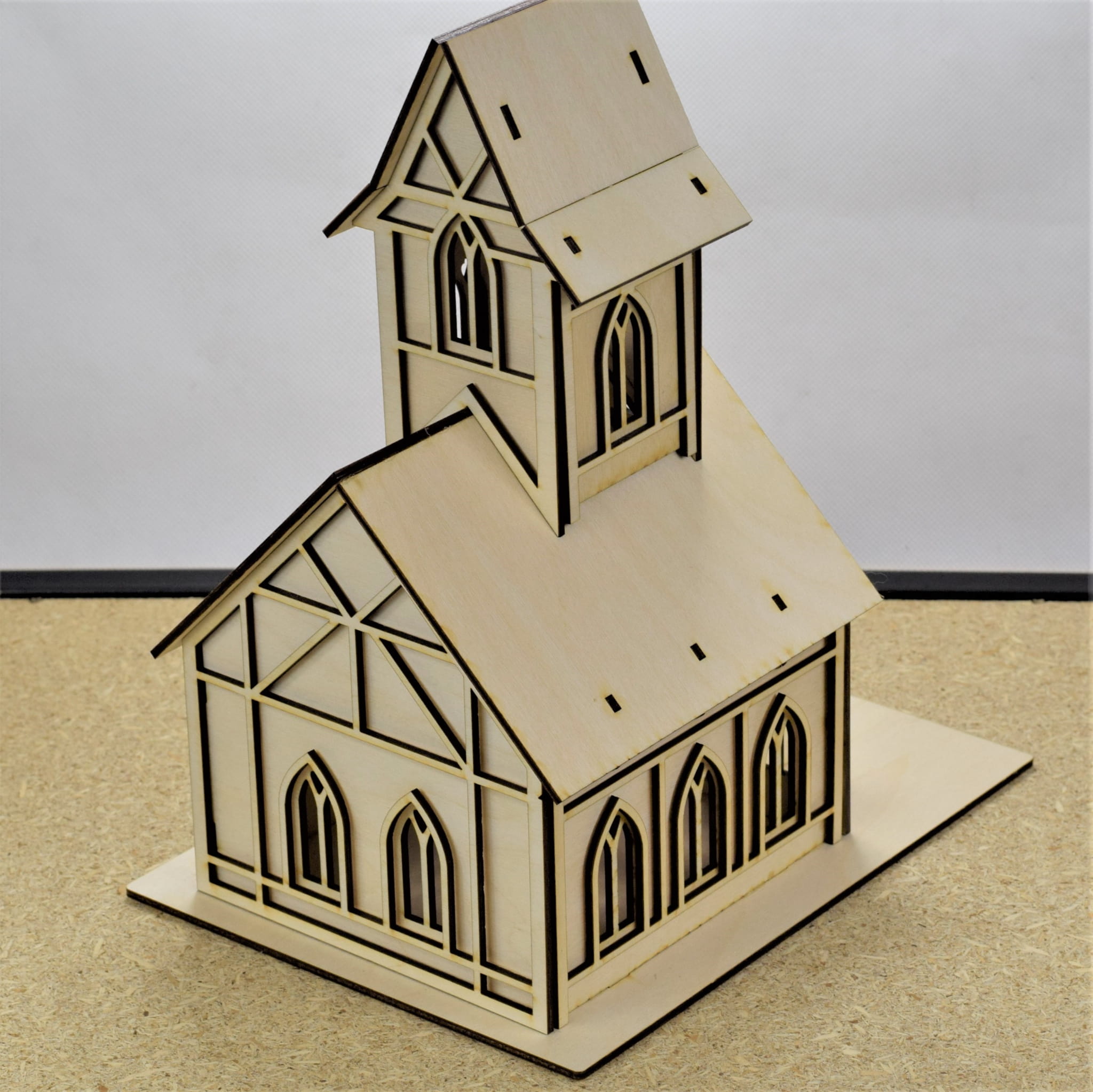 Lampion wycięty jest ze sklejki o grubości 3mm.Wymiary lampionu: podstawa - 25cm x19cm, bryła kościółka: szer. 14,8cm x dług.17,7 wysokość razem z dzwonnicą 29,7cm.