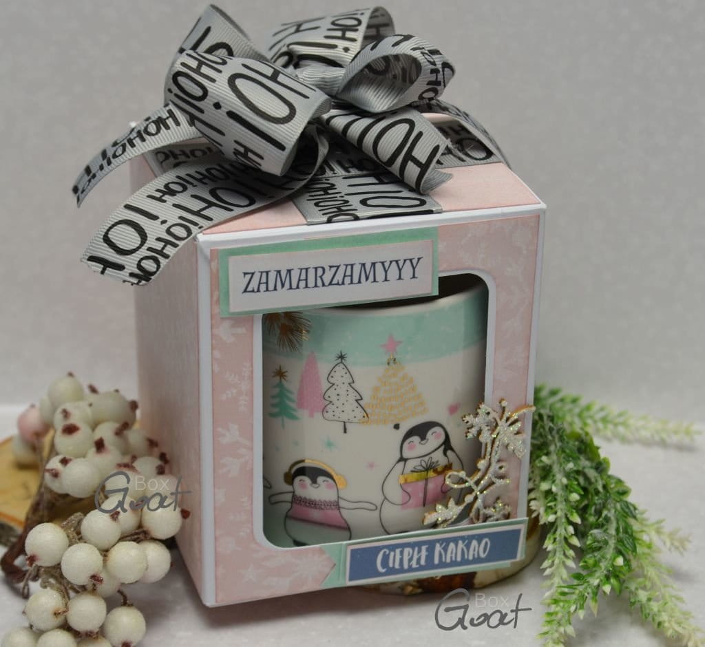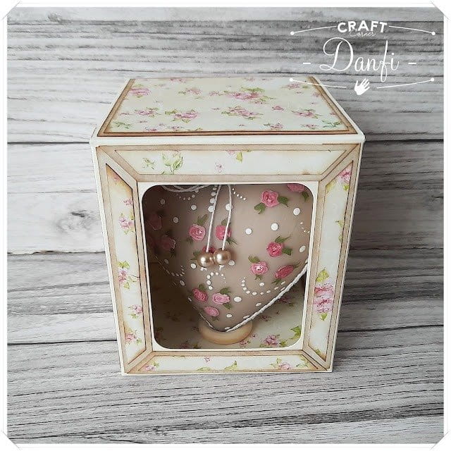 Baza kartonu ozdobnego na bombkę lub kubek. Pudełko zamyka się od boku i od góry. Bardzo proste w złożeniu, nie wymaga klejenia. Posiada z jednej strony prostokątny otwór o wymiarach 83x68mm z zaokrąglonymi bokami. W zestawie z produktem jest wkładka centrująca utrzymująca bombkę w środkowej części pudełka. Baza wykonana z wysokiej jakości papieru o dużej gramaturze która zapewnia odpowiednią sztywność konstrukcji. Pudełko można dodatkowo zdobić lub pozostawić w kolorze naturalnym.