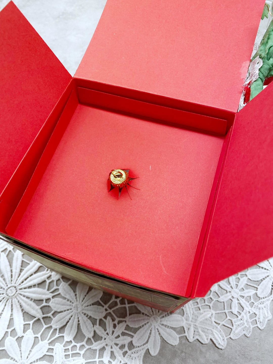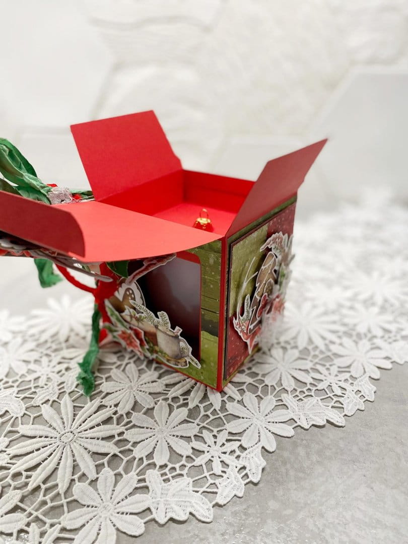 W przypadku, gdy do pudełka wkładamy bombki, dodatkowa wkładka z elementem mocującym powinna być umieszczona nad bombką na górze pudełka, by przytrzymać szyjkę i zapobiec przekręcaniu się bombki. Dzięki temu siedzi ona w odpowiedniej pozycji umieszczona przodem do okienka (dwa ostatnie zdjęcia obrazujące w czerwonym pudełku).