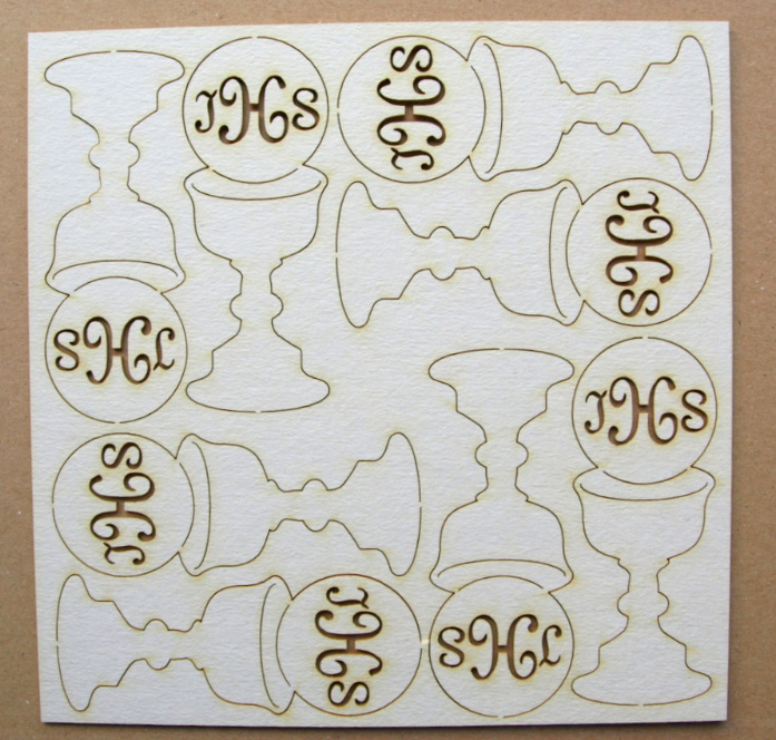 N arkuszu jest 8 sztuk kielichów z hostią o wym.2,8cm x 7,1cm.Trzeba użyc ostrego nożyka by ponacinać elementy i wyciągnąć je z arkusza.