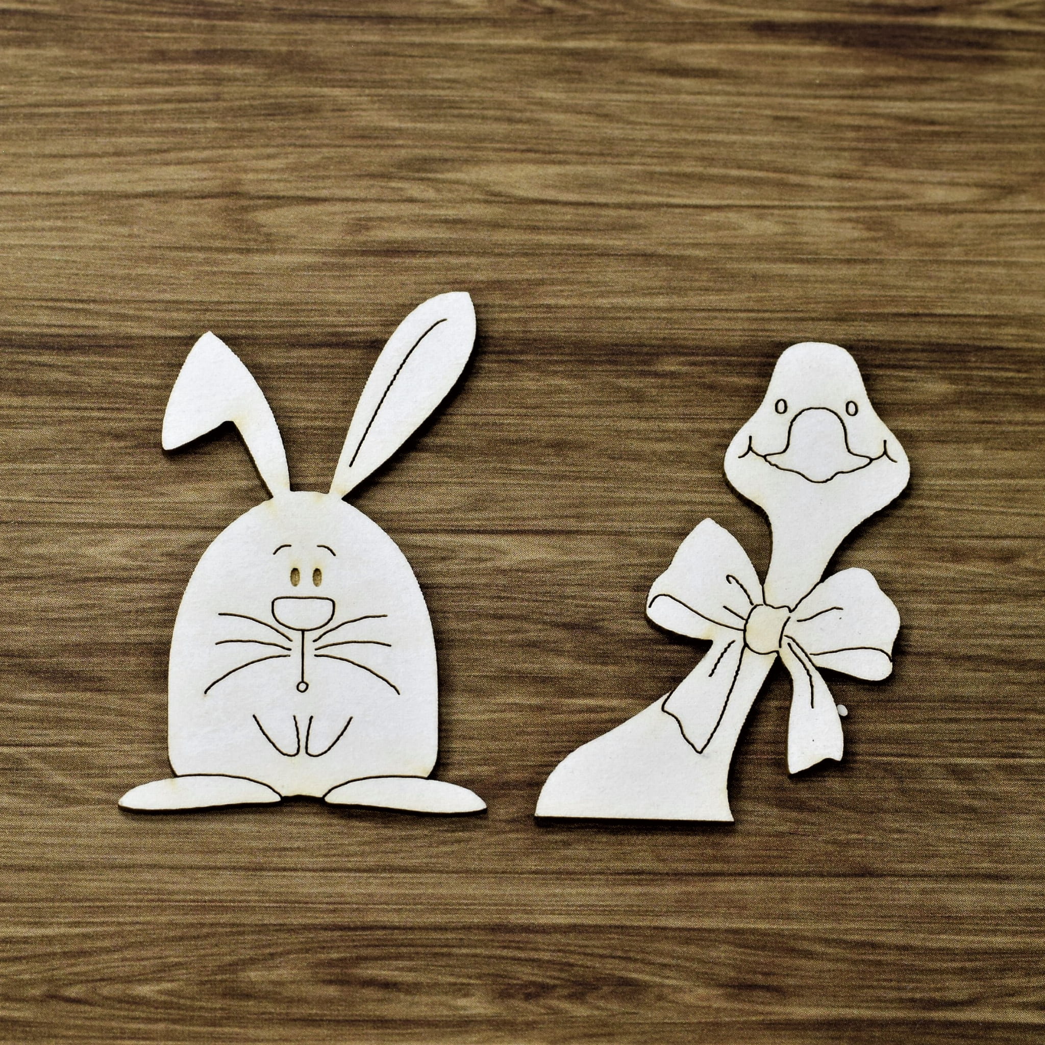 Zestaw 2 tekturek z motywami wielkanocnymi. Przykładowa wielkość zajaczka:30mm x 45mm. Wycięte z beermaty o grubości 1,5mm.